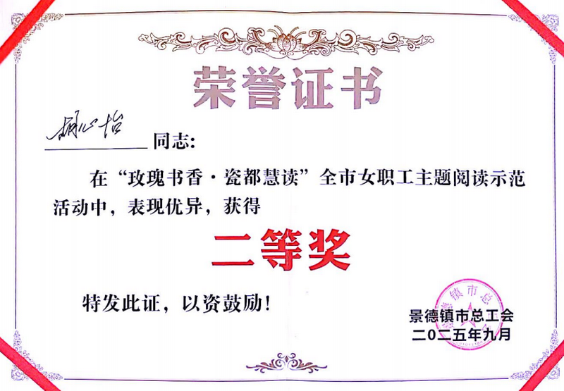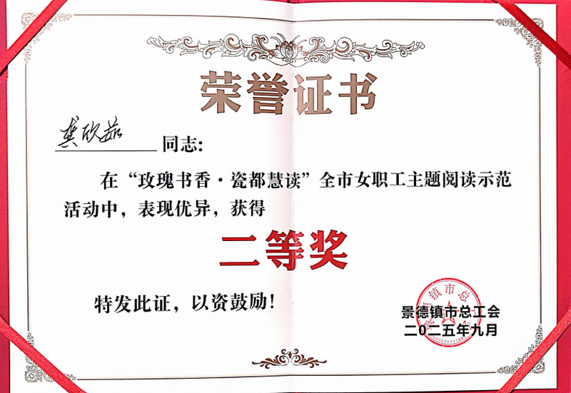 9月19日下午,在景德鎮(zhèn)市總工會舉辦的“玫瑰書香 瓷都慧讀”全市女職工示范閱讀活動中,陶博城公司女職工胡心怡、龔欣茹代表國控集團參賽,憑借情景朗誦作品《瓷間玫瑰,書香漫卷》脫穎而出,以 97.70分的優(yōu)異成績(位列第二),榮獲本次活動二等獎!