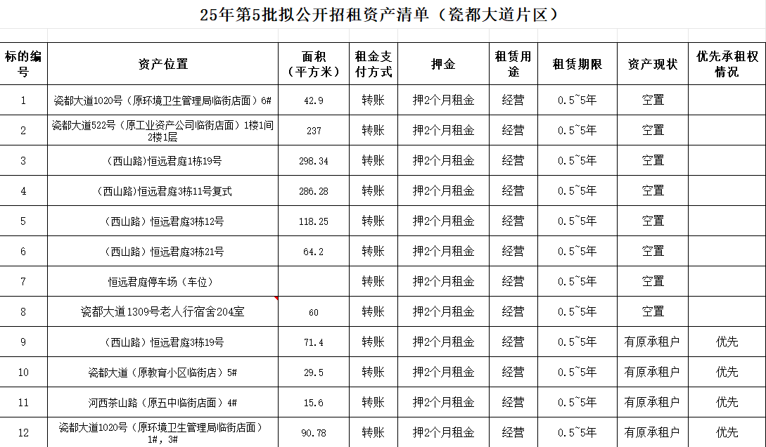 現(xiàn)位于瓷都大道片區(qū)資產(chǎn)進(jìn)行公開招租,具體招租標(biāo)的物信息面積詳見《招租清單》。